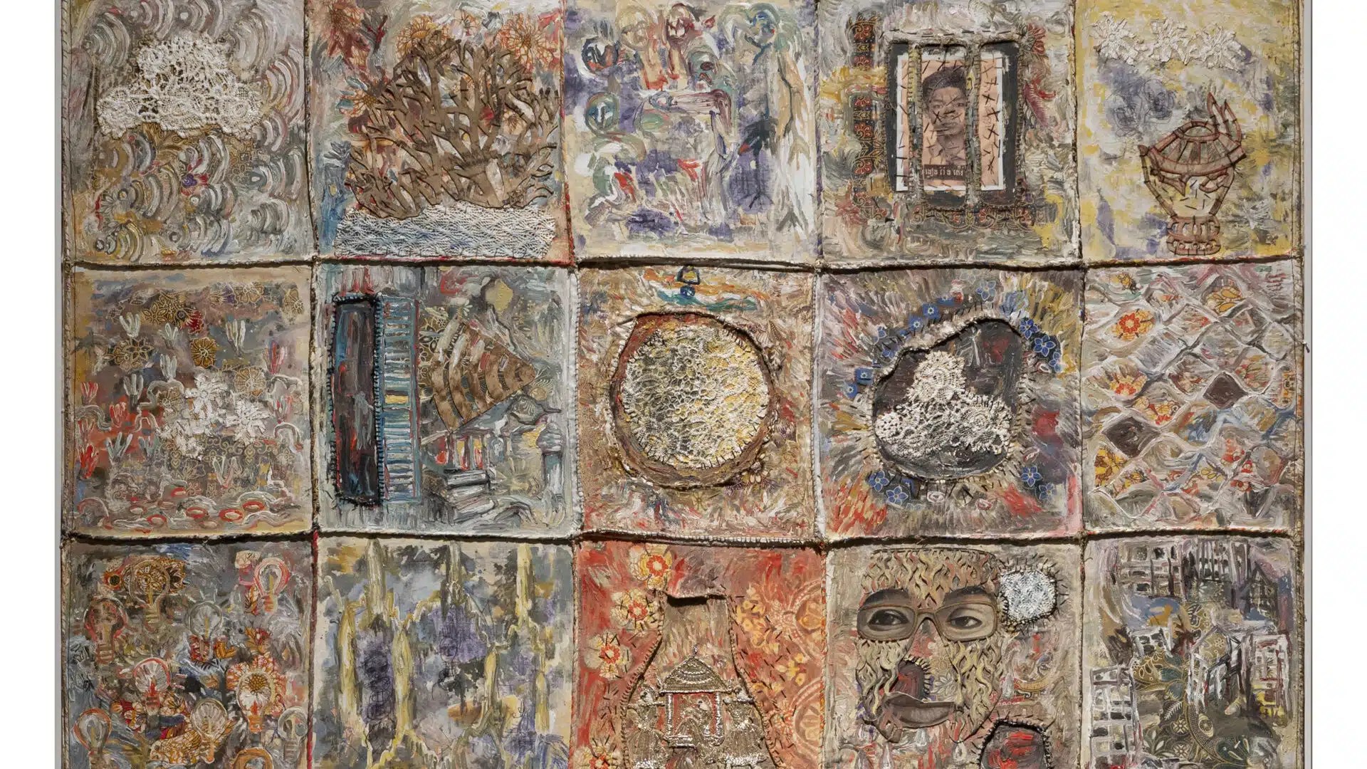 Influenced by his personal history, Seckon’s practice has been deeply autobiographical with intimate narratives of his childhood memories often juxtaposed with social and political commentaries and pop culture references. Working with the medium of collage and canvas, he often stitches the found material from magazines, pamphlets and newspapers with textile elements into the composition.