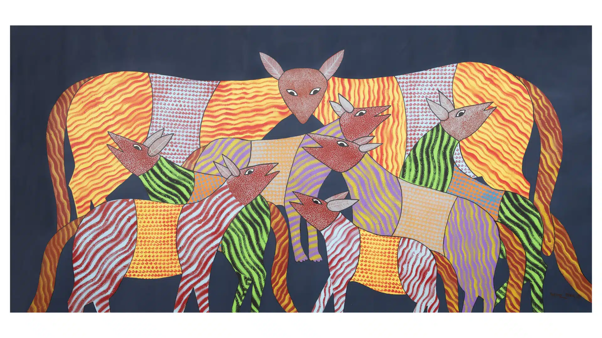 The exhibition brings together artworks of three artists from different genres, Madhubani, Gond and Warli by three artists, Krishnanand Jha, Bhajju Shyam and Mayur and Tushar Vayeda. The artists belong to three distinct generations: Jha, a legendary guru, Shyam, a master artist and Vayeda, a promising artist in the indigenous art space. Visually, the artworks are very different. The narratives are inherently organic and even through the three artists are from diverse genres, there is a univocal merging and the creation of a timeless narrative.
