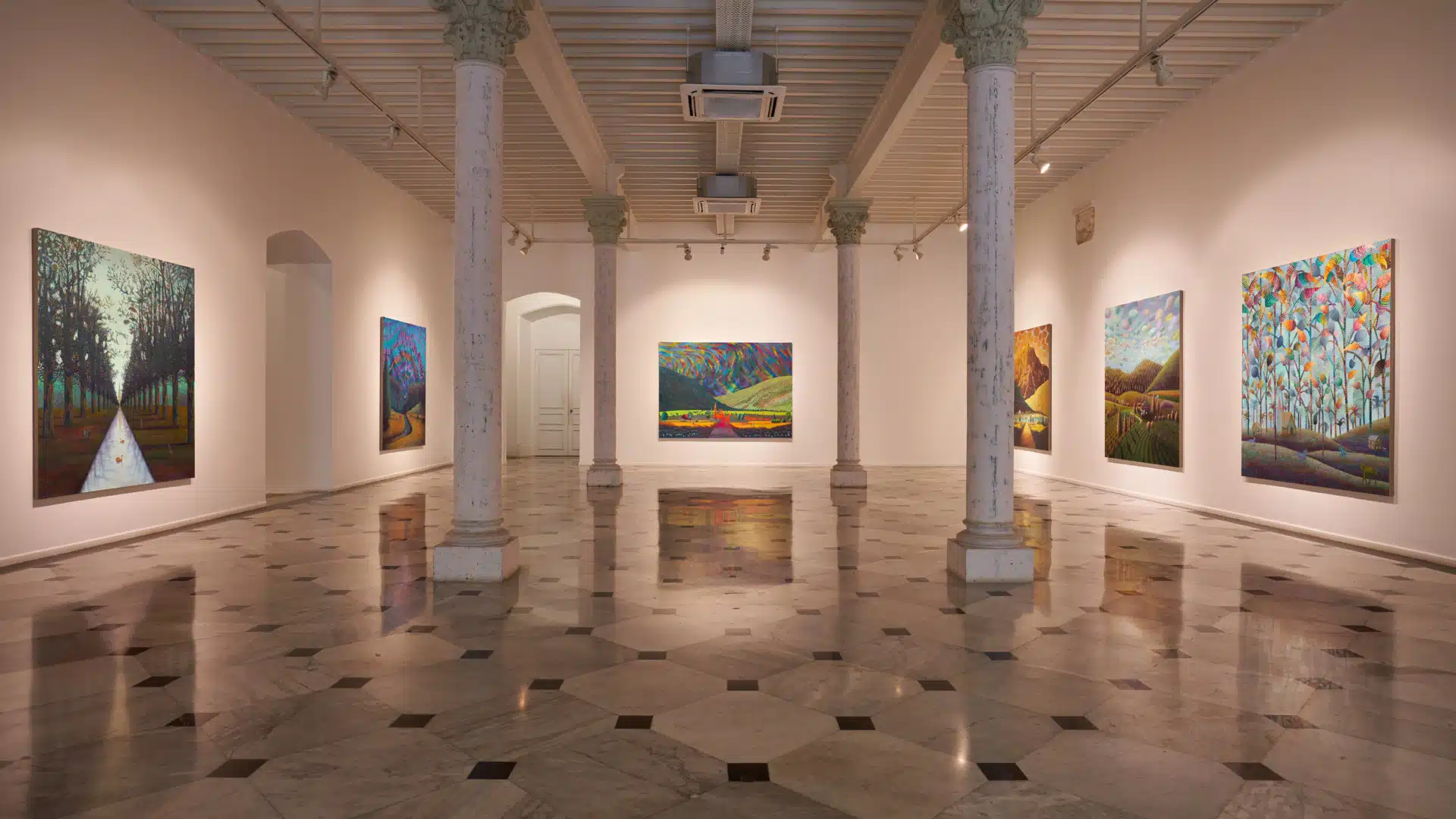 He has never before used a single word for an exhibition and explains that he ‘likes the idea of doing so’, for two reasons: the first being that he began preparing for the show by dividing the paintings he was making according to different countries or places he had always wanted to see. Each painting took inspiration from Smith’s imaginings of the landscapes or scenes there – even though the artist did not actually travel to visit the respective places themselves. Rather – like Henri Rousseau with his jungle paintings, Smith went on an imaginary – or we might say now, a ‘virtual’ journey. The genesis for this process was born out of what Smith describes as ‘a longing to explore.’ So the artist undertook a trip (of sorts), but also, – and this brings us to the second reason why Smith likes this one word title – the term ‘tripper’ is significant for Smith when explaining his work to someone unfamiliar with his paintings.