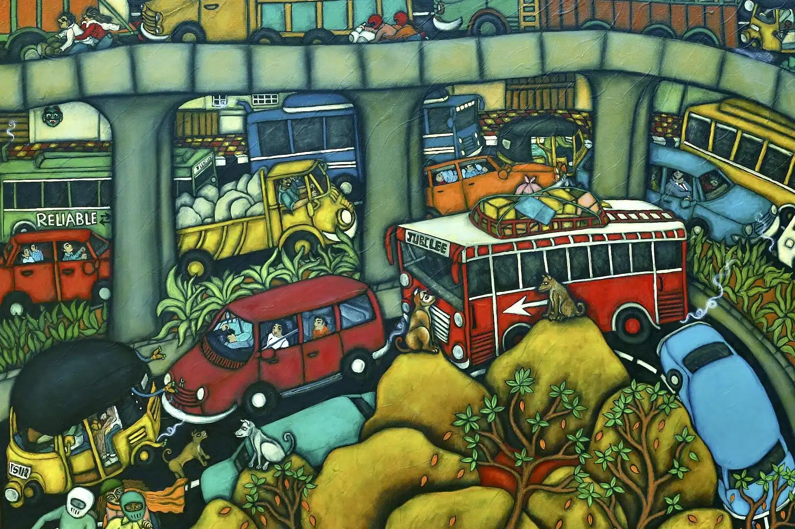 In words of the artist: “It is a wistful contemplation of the picturesque purity of my childhood memories juxtaposed with contemporary reality—soaring skyscrapers, free-flowing flyovers, power towers, merging metro lines, rusty dust, fifty fumes, and the cacophony of ceaseless traffic, incessant honking, roaring drill machines and exploding rock that shake the very foundation of our once peaceful neighbourhoods. ”