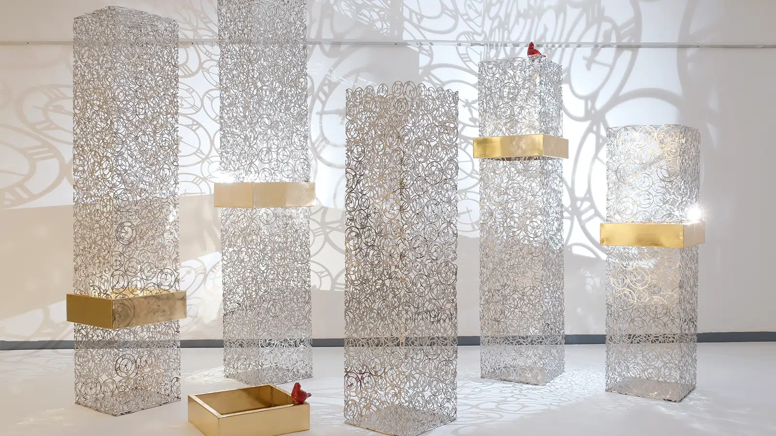 Leila Heller Gallery presents the work of sculptor Sonal Ambani, We Dream Under the Same Sky. The sculpture is an enigma as much as it is a modern sculpture, that is coded in the intricately crafted time pieces on the pillars that represent the birthdates of great visionaries from around the world. Ambani sculpts with the intention of challenging the viewer to create their own meaning by reflecting upon their own life experiences. She believes that art needs to find that balance between visual elegance and intrinsic contemplation.