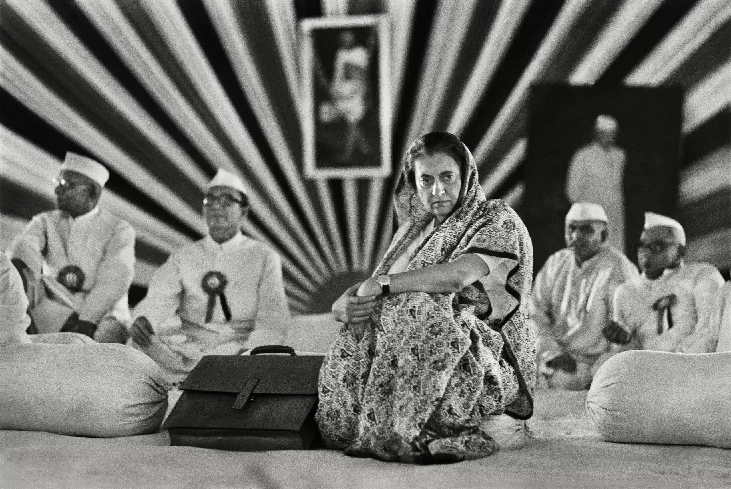 Top: Local commuters at Church Gate railway station in Mumbai. 1995. Bottom: Indira Gandhi at Congress Session, 1967. Courtesy of the artist