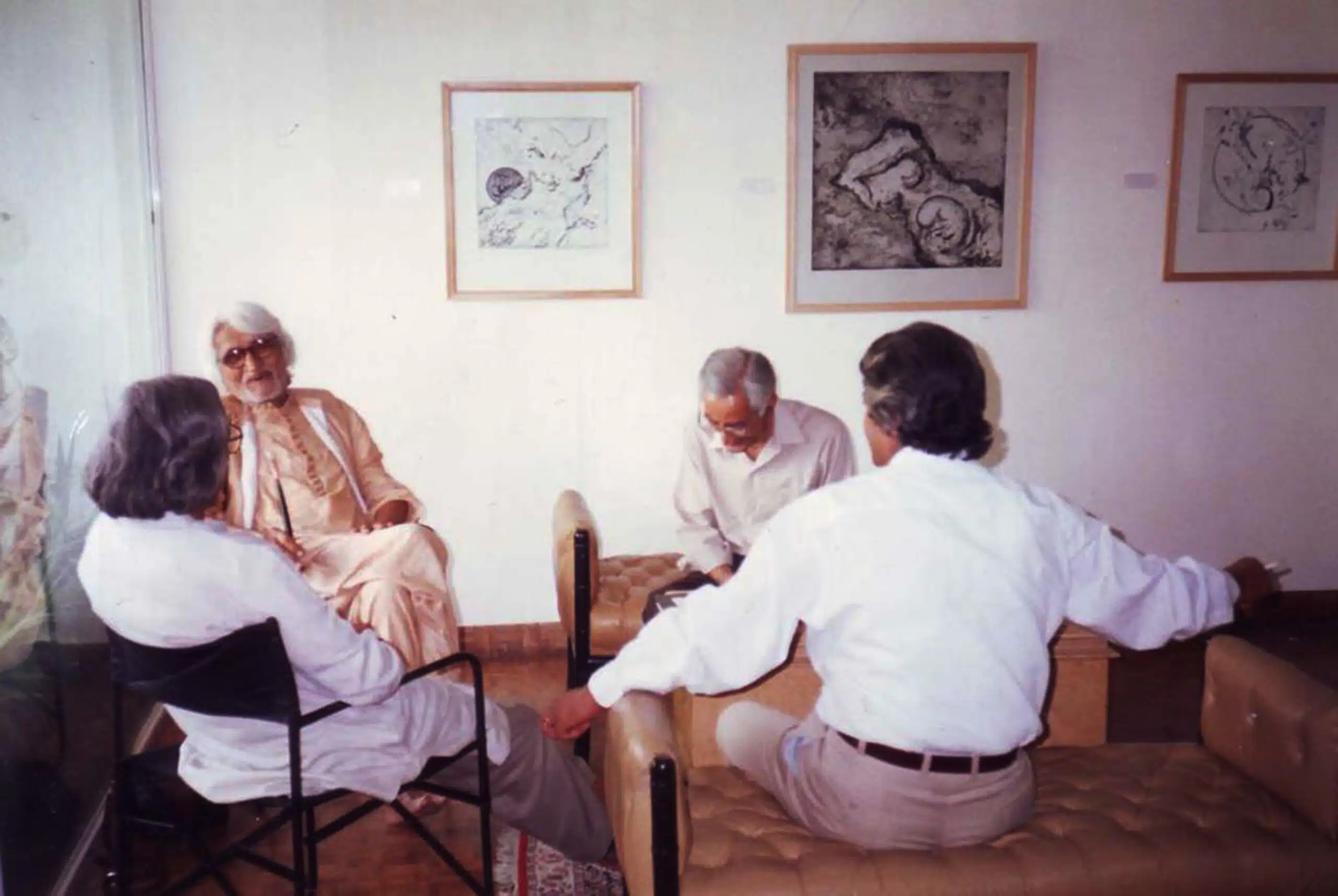 Arun Vadehra with modernists Tyeb Mehta, M.F. Husain and Ramkumar at the gallery in New Delhi. Courtesy of Vadehra Art Gallery
