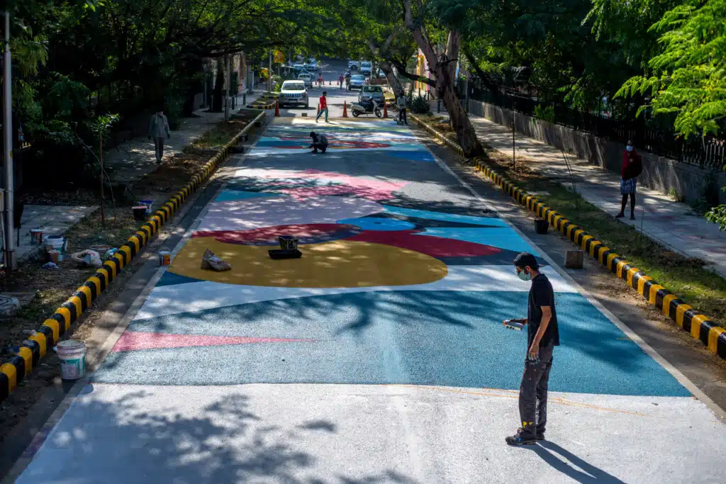 Khatra in the process of completing a ‘painted’ cycle lane in Lodhi Colony in 2020. Courtesy of the artist.
