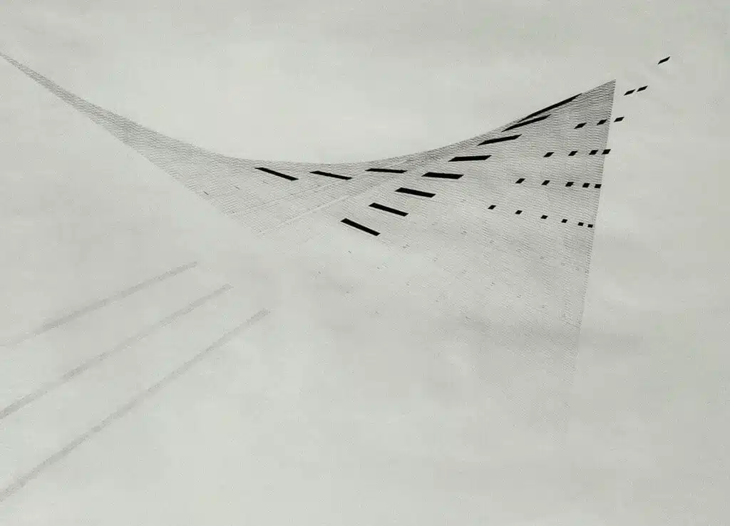 In Nasreen’s later work, her lines found release from the grid, and took on a quality of electric vitality. Lines and planes lifted off into the air, as if breaking free of gravity’s confines. This is perhaps what gives her drawings a feeling of levity. In one of her many ruminations, Mohamedi likened her work to that of electricians, both involving the “strain between concentration and danger hung on a rope.”